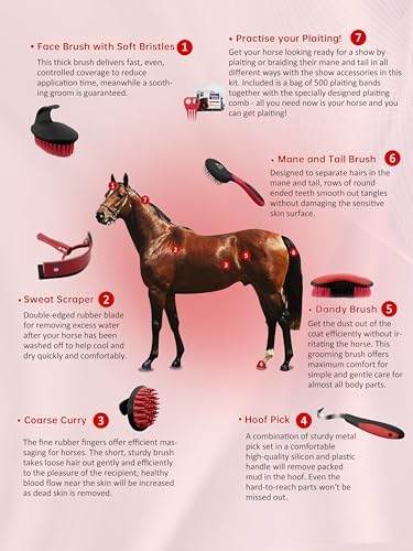 El kit Harrison Howard rojo contiene siete herramientas con bolsa organizadora. El cepillo de cerdas largas alcanza zonas difíciles de la barriga. El peine de metal templado desenreda colas gruesas sin romper. Incluye masajeador de goma que estimula la circulación. Cada pieza tiene logo grabado para identificación rápida. La bolsa de nylon incluye asa y correa de hombro. Perfecta para jinetes que viajan a clínicas veterinarias. Un conjunto premium para el cuidado meticuloso del equino.